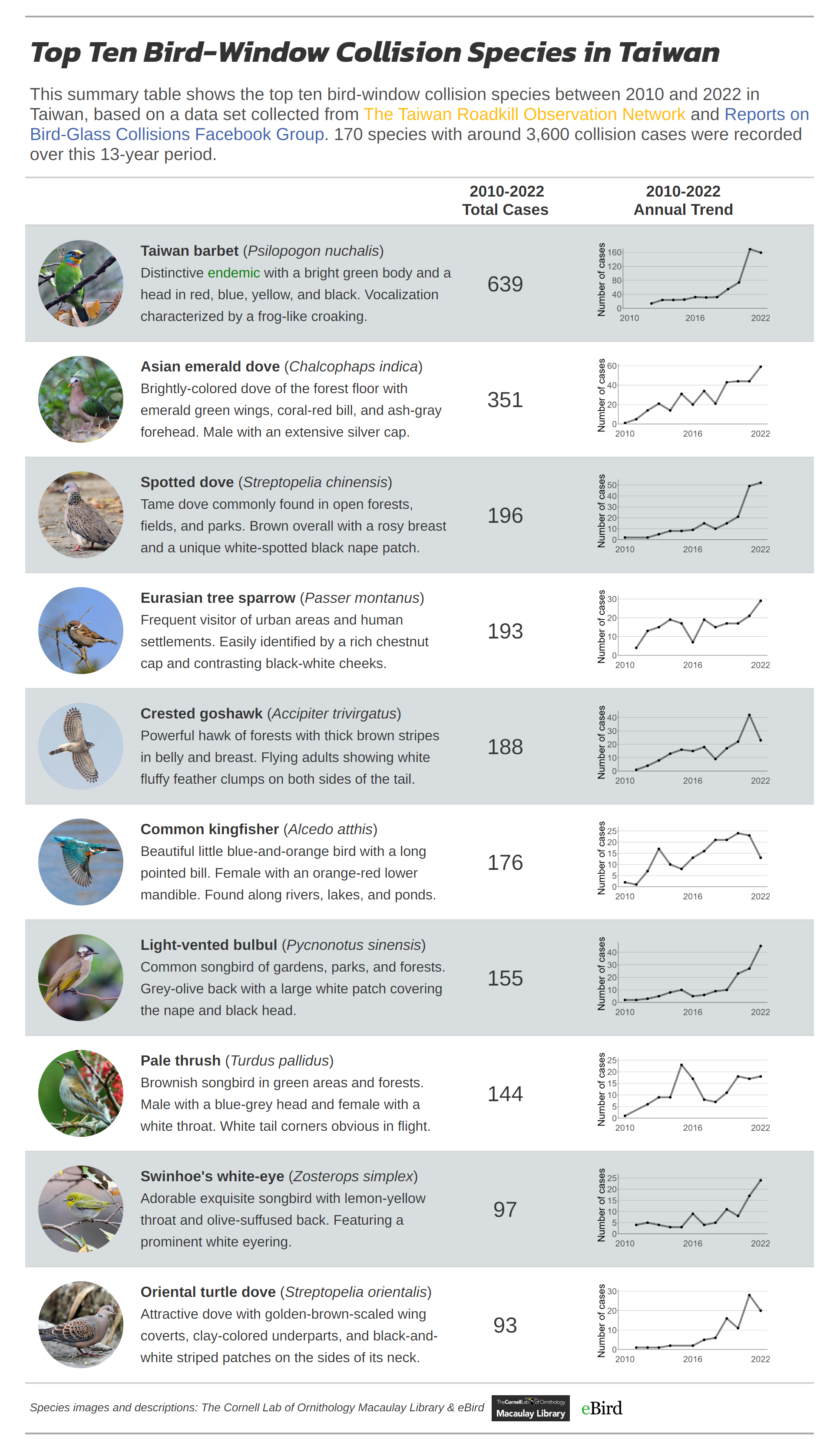 An awesome integration of `gt` and `ggplot2` tells the story of the top ten bird-window collision species in Taiwan!