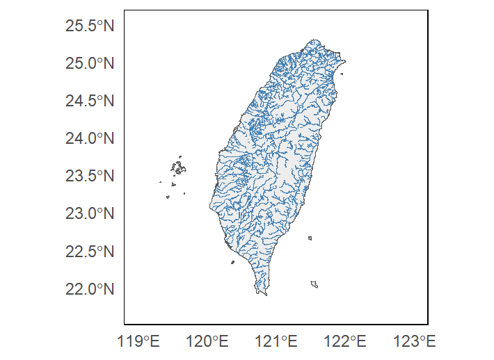 In this post, we will create a map of the rivers in Taiwan in ggplots using the package `osmdata`.